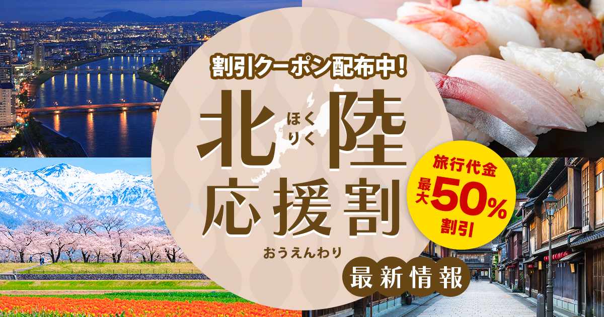 旅行代金最大50%割引!国内旅行(宿泊・国内ツアー)で使える割引クーポンを配布中。旅行で北陸を応援!