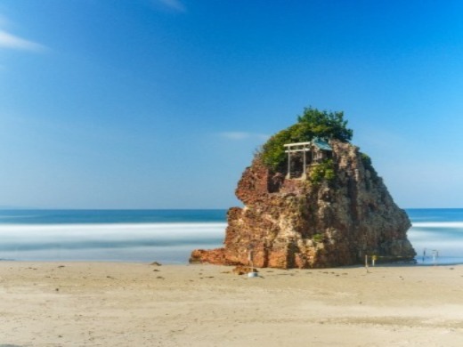 出雲大社の西方1kmにある海岸で国譲り、国引きの神話で知られる浜です。国譲り神話では、この浜で大国主大神と武甕槌神が国譲りの交渉をしたと言われています。海岸の南には国引き神話で島を結ぶ綱になったという長浜海岸(薗の長浜)が続いています。また、この浜は旧暦10月10日に、全国の八百万の神々をお迎えする浜でもあります。夕日の名所としても知られ、夕方になると美しい夕景を見ようと大勢の方が集まります。