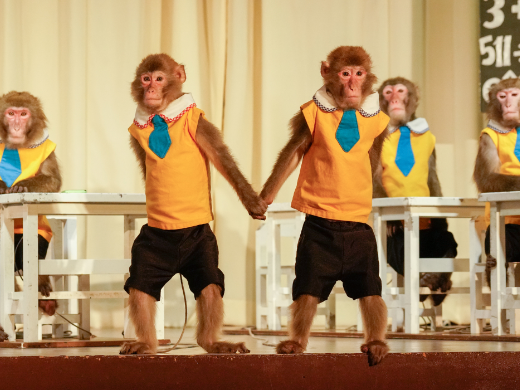 メインステージでは、180度パノラマの映像をバックにスペクタクルなドラマがおさるさんによって繰り広げられます。冷暖房完備の劇場なので、季節や天候の心配をすることなくショーをお楽しみいただけます。