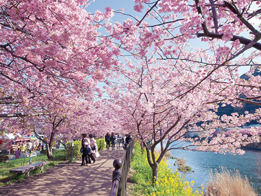 本州一の早咲き桜として知られる河津桜。あでやかなピンクの花が街を埋め尽くし、ひと足早く春を感じられます。